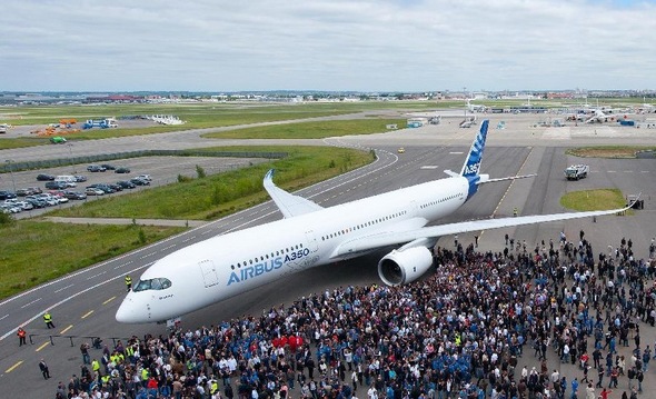 5月13日,在法國圖盧茲,空中客車公司(空客)員工慶賀首架空客A350XWB寬體飛機完成整體涂裝。