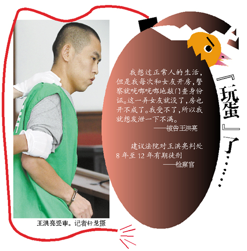 昨日,該案在深圳寶安法院開(kāi)庭,被告王洪亮在法庭上認(rèn)罪,并自述犯罪動(dòng)機(jī):“我想過(guò)正常人的生活,但是我每次和女友開(kāi)房,警察就咣啷咣啷地敲門查身份證。這一弄女友就沒(méi)了,房也開(kāi)不成了。我受不了,所以我就想發(fā)泄一下不滿!