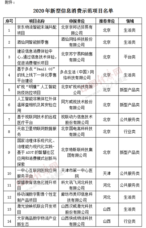 經(jīng)濟(jì)日?qǐng)?bào)-中國(guó)經(jīng)濟(jì)網(wǎng)北京8月11日訊 日前,工業(yè)和信息化部公示了2020年新型信息消費(fèi)示范項(xiàng)目,共100個(gè)項(xiàng)目入選。