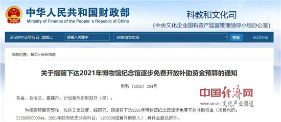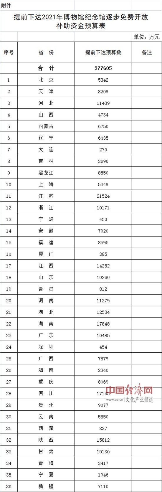 經(jīng)濟日報-中國經(jīng)濟網(wǎng)北京12月15日訊 近日,財政部官網(wǎng)發(fā)布了《關(guān)于提前下達2021年博物館紀念館逐步免費開放補助資金預(yù)算的通知》,31個?。ㄗ灾螀^(qū)、直轄市)及5個計劃單列市補助資金預(yù)算總計277605萬元。
