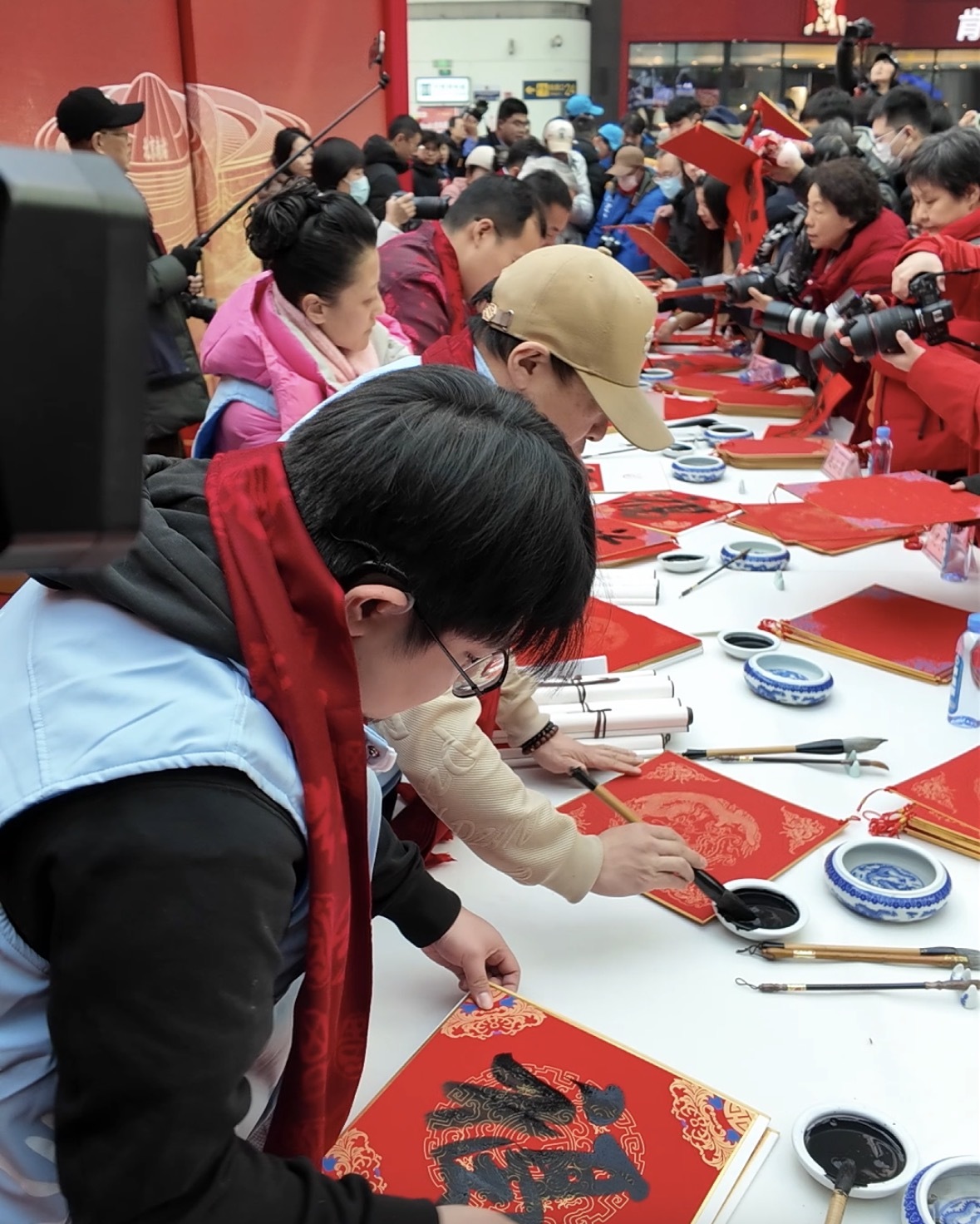 “旅途賀新春、溫暖回家路”春運(yùn)送溫暖文明實(shí)踐活動在北京南站候車大廳上演。書法家們?yōu)槁每蜁鴮懜W帧V袊?jīng)濟(jì)網(wǎng)記者鞠然/攝