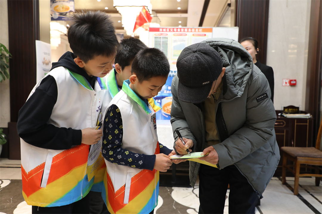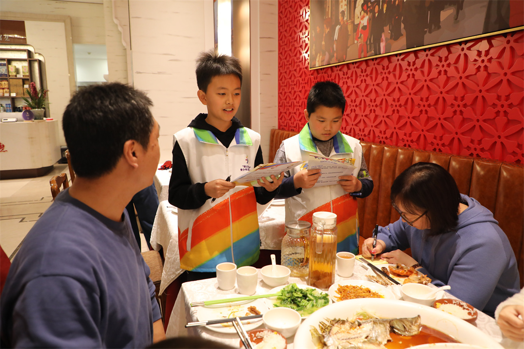 志愿者們還學(xué)以致用,化身“制止餐飲浪費(fèi)宣傳員”,向餐廳中的食客宣傳節(jié)糧反浪費(fèi)知識(shí),發(fā)放節(jié)糧知識(shí)宣傳單,并邀請(qǐng)食客寫(xiě)下自己節(jié)約糧食和避免浪費(fèi)的心得。在店食客積極參與留言并對(duì)小志愿者的宣講表示認(rèn)同。