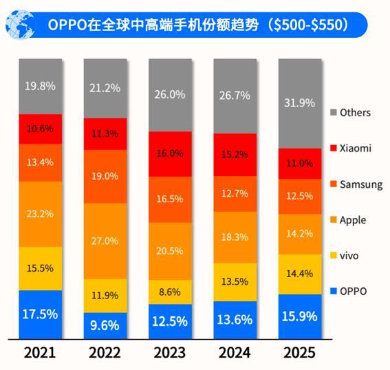 500–550 美元是全球智能手機市場公認的"高端入口"價格帶,是所有手機廠商的必爭之地。IDC 數(shù)據(jù)顯示,2025 年 OPPO 在這一價格段的全球市場份額已穩(wěn)居行業(yè)第一,成為該價格區(qū)間市場領導者。