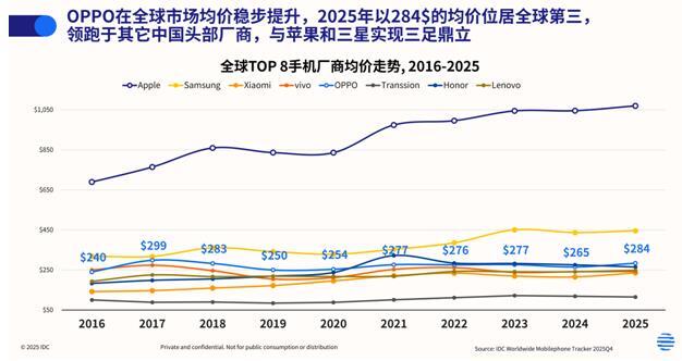均價是衡量品牌高端化成色最直接的標尺。IDC 數(shù)據(jù)顯示,2025 年 OPPO 全球智能手機均價達 284 美元,在全球出貨量 TOP 8 廠商中僅次于蘋果與三星,位列第三,同時以顯著優(yōu)勢領跑所有其他中國頭部手機品牌。