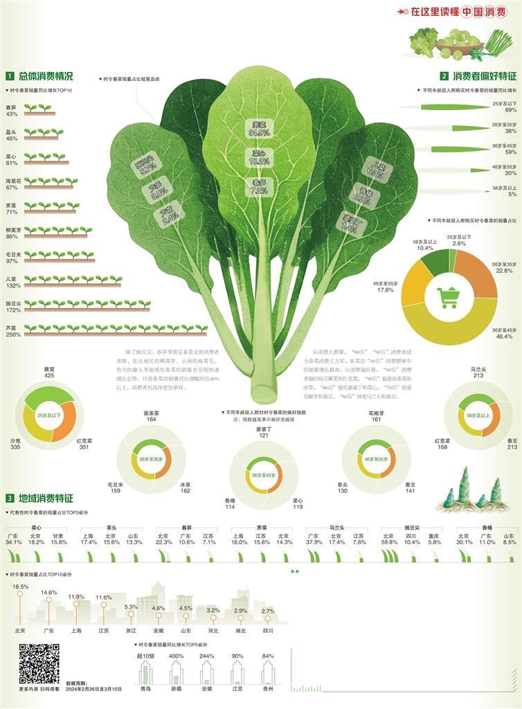 有趣的是,春菜消費(fèi)也呈現(xiàn)出顯著的地域偏好特征。上海消費(fèi)者最愛(ài)選購(gòu)草頭、薺菜,酒香草頭、薺菜餛飩是春日餐桌上的心頭好;川渝消費(fèi)者尤為鐘愛(ài)鮮嫩可口的豌豆尖和氣味獨(dú)特的折耳根;北京消費(fèi)者最愛(ài)香椿,同時(shí)春筍、蠶豆等也是餐桌上不可或缺的美味;廣東消費(fèi)者最愛(ài)的春菜當(dāng)屬菜心;對(duì)于江浙地區(qū)的消費(fèi)者而言,他們最喜歡選購(gòu)春筍、馬蘭頭、薺菜、蘆筍等。