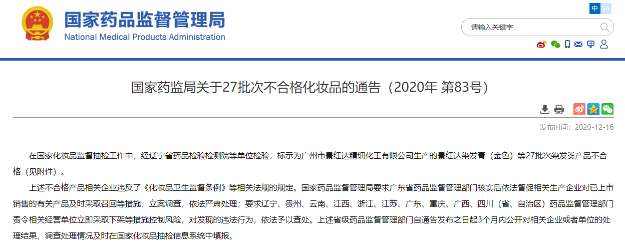 在國家化妝品監(jiān)督抽檢工作中,經(jīng)遼寧省藥品檢驗檢測院等單位檢驗,標(biāo)示為廣州市景紅達(dá)精細(xì)化工有限公司生產(chǎn)的景紅達(dá)染發(fā)膏(金色)等27批次染發(fā)類產(chǎn)品不合格。