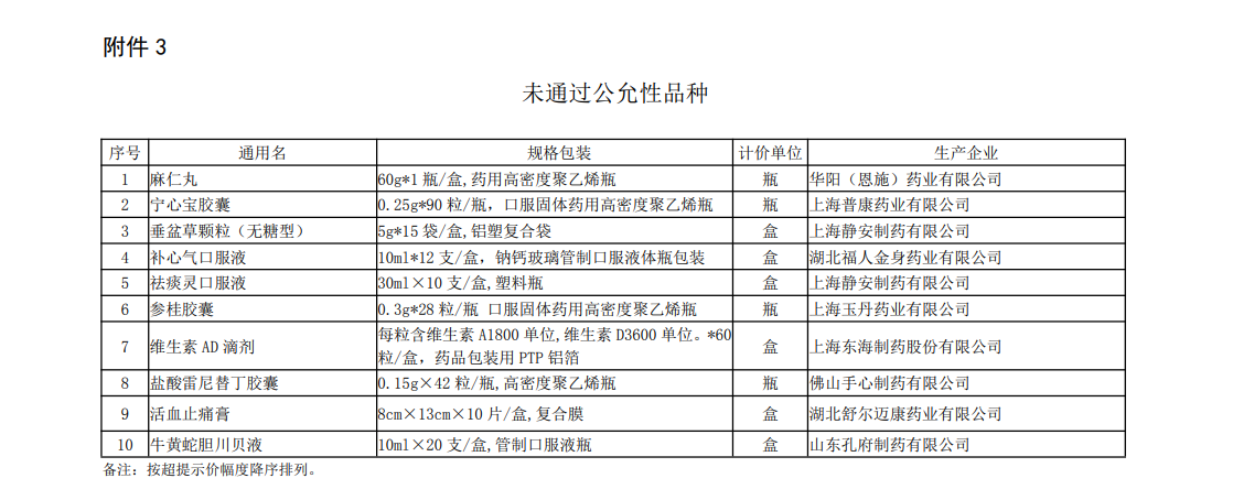 譬如,新申請超“黃線”品種名單中,北京同仁堂科技發(fā)展股份有限公司制藥廠麻仁潤腸軟膠囊、云南白藥集團(tuán)股份有限公司云南白藥氣霧劑系獨(dú)家品種;原在庫超“黃線”品種名單中,浙江泰利森藥業(yè)有限公司瑞格列奈二甲雙胍片(II)是獨(dú)家品種;未通過公允性品種名單中,湖北福人金身藥業(yè)有限公司補(bǔ)心氣口服液、上海玉丹藥業(yè)有限公司參桂膠囊是獨(dú)家品種;重點(diǎn)監(jiān)控品種名單中,吉林津升制藥有限公司注射用二羥丙茶堿為獨(dú)家品種。